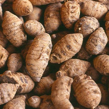 - 강황은 울퉁불퉁한 생강 형태의 뿌리줄기로, 껍질을 벗기면 진한 주황색이 드러납니다. 특유의 흙내음과 쌉싸래한 맛이 강하며, 카레의 색을 내는 대표적인 원료로 쓰입니다.