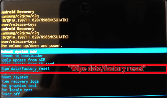 - 복구 모드 화면이 나타나면, 볼륨 버튼을 이용해 'Wipe data/factory reset' 옵션을 선택하고 전원 버튼을 눌러 확인합니다.