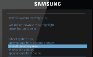 - 복구 모드 화면에서 볼륨 버튼을 이용해 'Wipe data/factory reset' 옵션을 선택하고 전원 버튼을 눌러 확인합니다.
