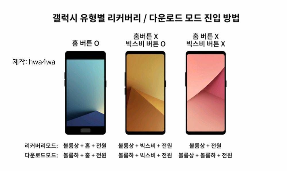 ✔다운로드 모드: 오딘 등의 프로그램으로 컴퓨터와 연결하여 강제적으로 펌웨어를 설치하는 용도로 주로 사용