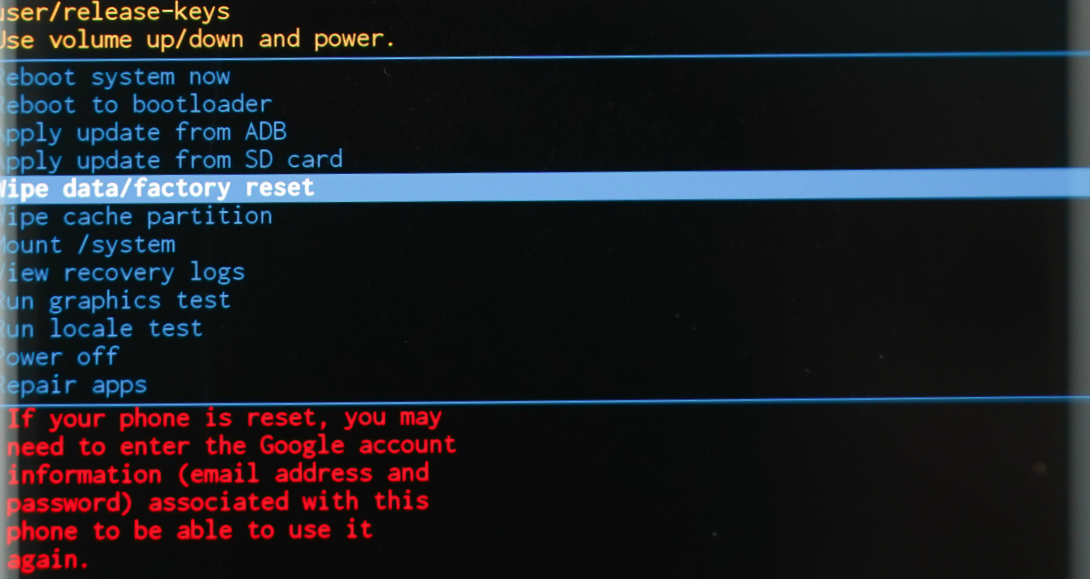 - Wipe data/factory reset 메뉴로 이동하여 볼륨 버튼으로 선택합니다.