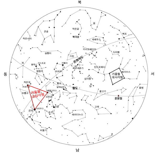 에리다누스자리는 남북으로 길게 뻗은 별자리로, 우리나라에서는 그 전부를 관측하기 어렵습니다. 이 별자리는 신화에서 강을 상징하며, 길고 부드러운 곡선을 그리는 별들이 특징입니다. 이러한 길고 유려한 선은 겨울 하늘을 더욱 드라마틱하게 만듭니다.