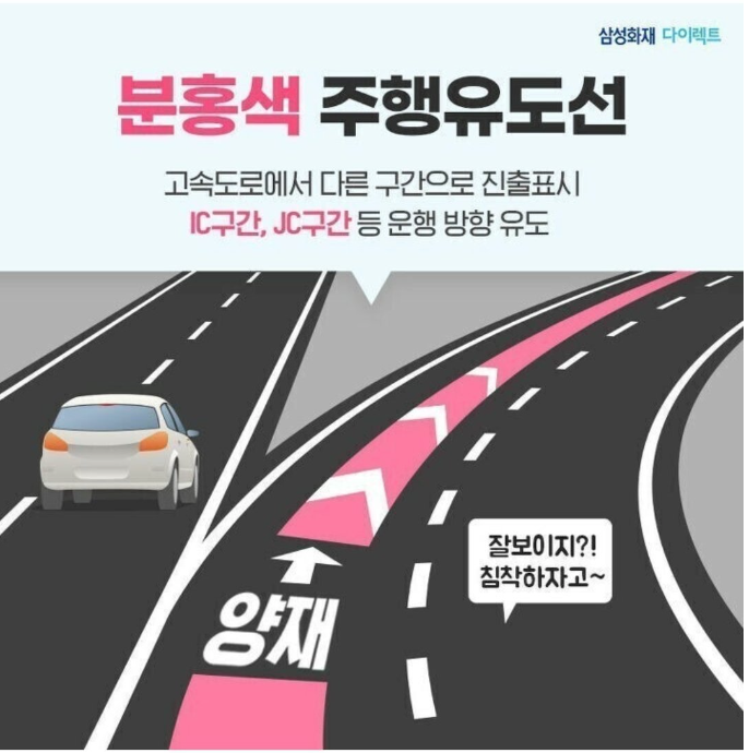 분홍색 주행유도선은 고속도로에서 특정 구간으로의 진출을 안내하는 중요한 역할을 합니다. 특히 IC(Interchange)나 JC(Junction) 구간에서 자주 보이는 이 유도선은 운전자가 출구를 정확히 인식하도록 돕습니다. 이러한 색상은 주목성을 높여 운전자가 방향을 놓치지 않게 하며, 잘못된 길로 들어서는 것을 방지합니다. 분홍색 유도선은 눈에 잘 띄어 긴급 상황에서도 안전하게 길을 찾을 수 있게 돕습니다.