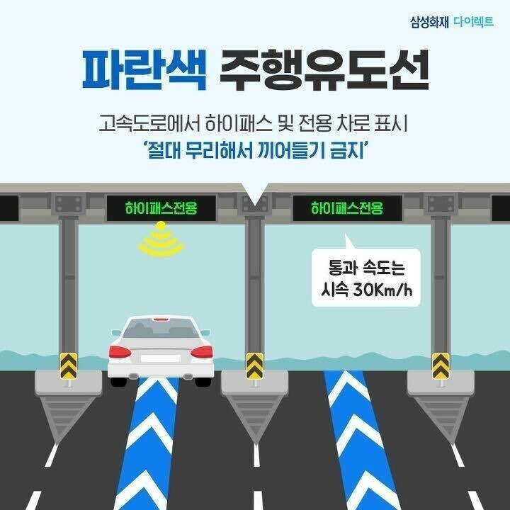 파란색 주행유도선은 하이패스 전용 차로를 나