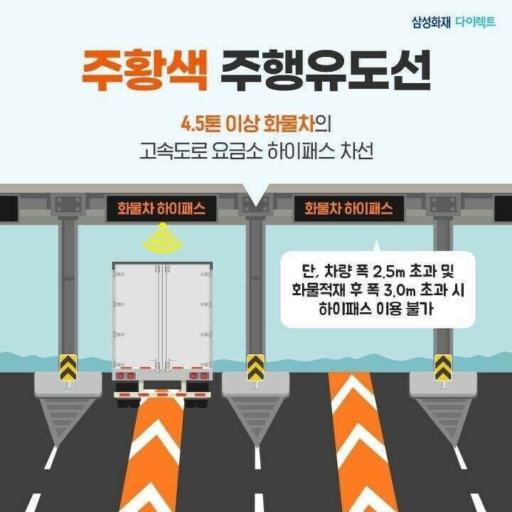 주황색 주행유도선은 4.5톤 이상의 화물차가 사용하는 전용 차선을 나타냅니다. 이 유도선이 있는 차로는 화물차가 안전하게 통과할 수 있도록 설계되었으며, 일반 승용차는 이 차로를 이용하지 않아야 합니다. 주황색 유도선은 특히 차량 폭이 2.5m를 초과하거나 화물 적재물이 3.0m를 초과하는 경우 하이패스를 이용할 수 있게 해 줍니다. 이를 통해 대형 차량이 원활하게 통과할 수 있도록 하며, 도로의 혼잡을 줄이는 데 기여합니다.