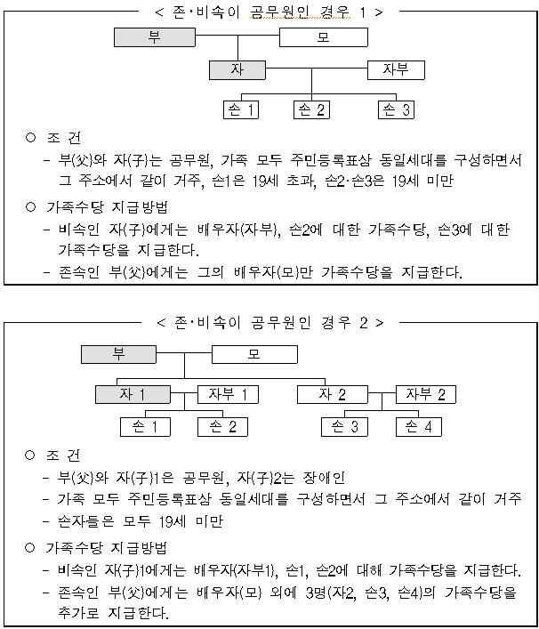 추가로, 공무원의 직계존속이 동일 세대에 포함되지만 부양가족으로 인정받지 못하는 경우에 대한 예외도 있습니다. 예를 들어, 부모님이 다른 곳으로 전출하거나 동일 세대 요건을 충족하지 못하는 경우에는 가족수당이 지급되지 않으므로 이 부분을 주의해야 합니다.