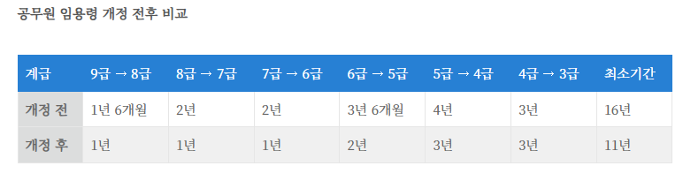 앞서 언급했듯이 ‘최소승진소요연수’와 ‘근속승진소요연수’는 엄연히 다릅니다. 최소승진소요연수는 승진을 위한 심사 자격 확보 기간을 말하고, 근속승진소요연수는 말 그대로 일정 기간 근속 시 자동으로 이루어지는 승진을 말합니다. 하지만 이 근속승진이라 해도 인사 적체로 인해 좀 더 늦어질 수 있고, 인사규정이나 해당 기관의 사정에 따라 다소 변수가 있습니다.