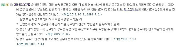- 공무원이 질병이나 부상으로 직무 수행이 곤란한 경우 병가를 허가할 수 있다.