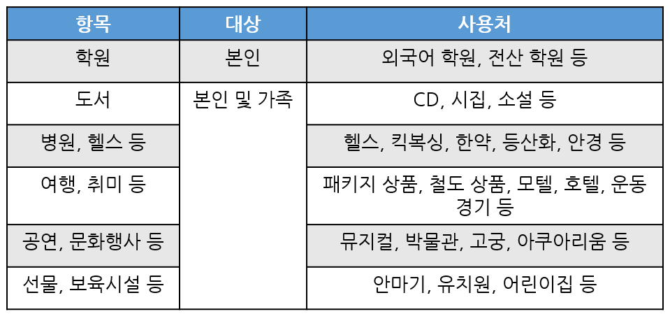 - 대학(원) 등록금 일부, 자격증·어학 학원, 온라인 강의