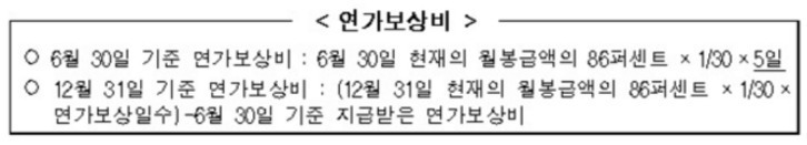 - 지급 시기 : 상반기 (6 월)·하반기 (12 월) 두 차례 또는 퇴직 직전