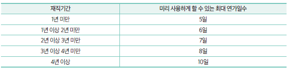- 미리 사용(선사용): 1 년 미만 5 일 → 4 년 이상 10 일까지 차년도 연가를 당겨 쓸 수 있음