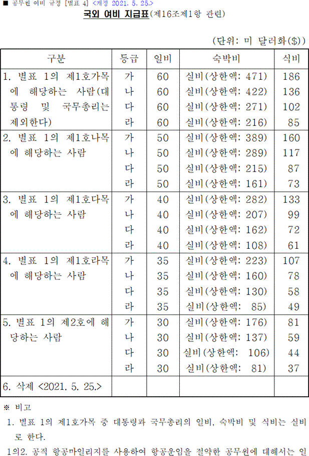 - 공적 항공마일리지 사용으로 항공운임을 절약하면 일비의 50% 추가 지급 가능. 단, 절약한 운임 범위 내.