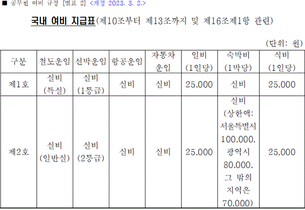 - [별표2] 국내여비 지급표(2023.3.2. 개정 반영본) - 일비·식비 25,000원, 숙박 상한 10만/8만/7만.