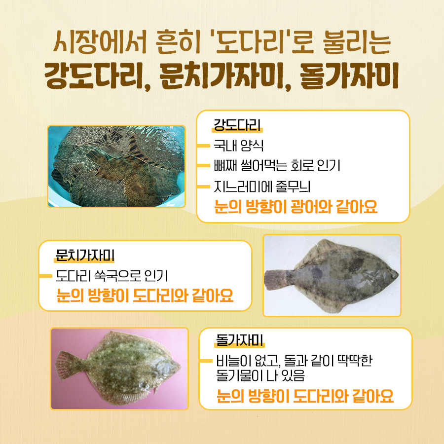 '좌광우도'를 포함하여, 지느러미의 줄무늬나 몸의 얼룩, 혹은 점의 배치 등을 관찰해 보면 기본적인 구분이 가능합니다. 예를 들어 강도다리는 왼쪽에 눈이 있지만 지느러미 줄무늬가 비교적 뚜렷하고, 돌가자미는 흰 점박이나 물집 같은 특징을 가집니다.