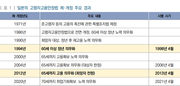 - 핵심 요소: 60세 정년 이후 재고용 의무, 합리적인 임금 조정 원칙, 직무·시간 재설계, 정부의 보조금·세제 지원.