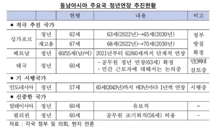 한국보다 덜 고령화되었고, 더 못사는 나라들인 동남아시아마저도 정년을 65세 이상으로 연장