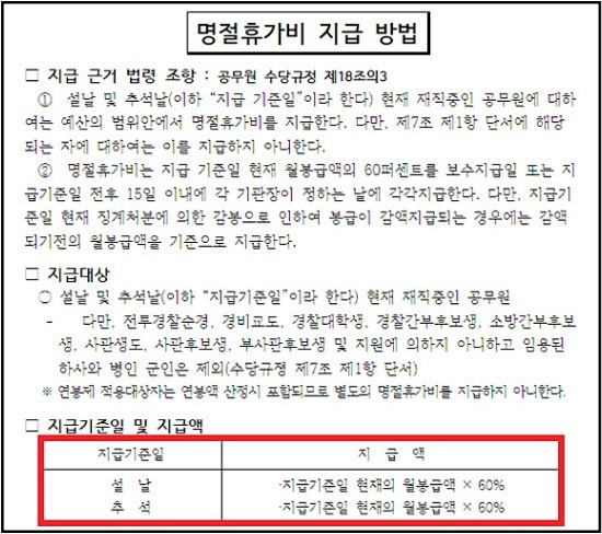 교사, 공무원 명절휴가비 지급 기준일 및 지급액