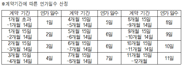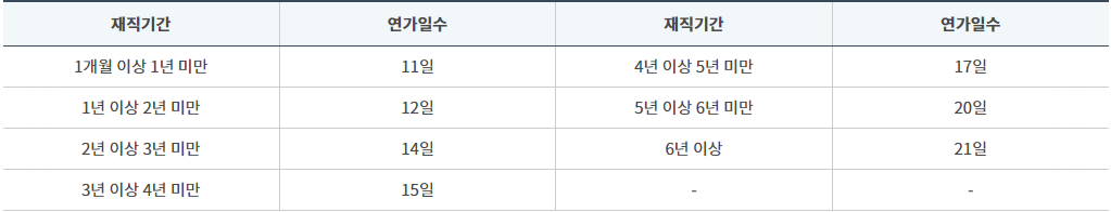 - 1년 단위 근무: 11일의 연가 부여, 이후 1년 단위로 1일씩 증가