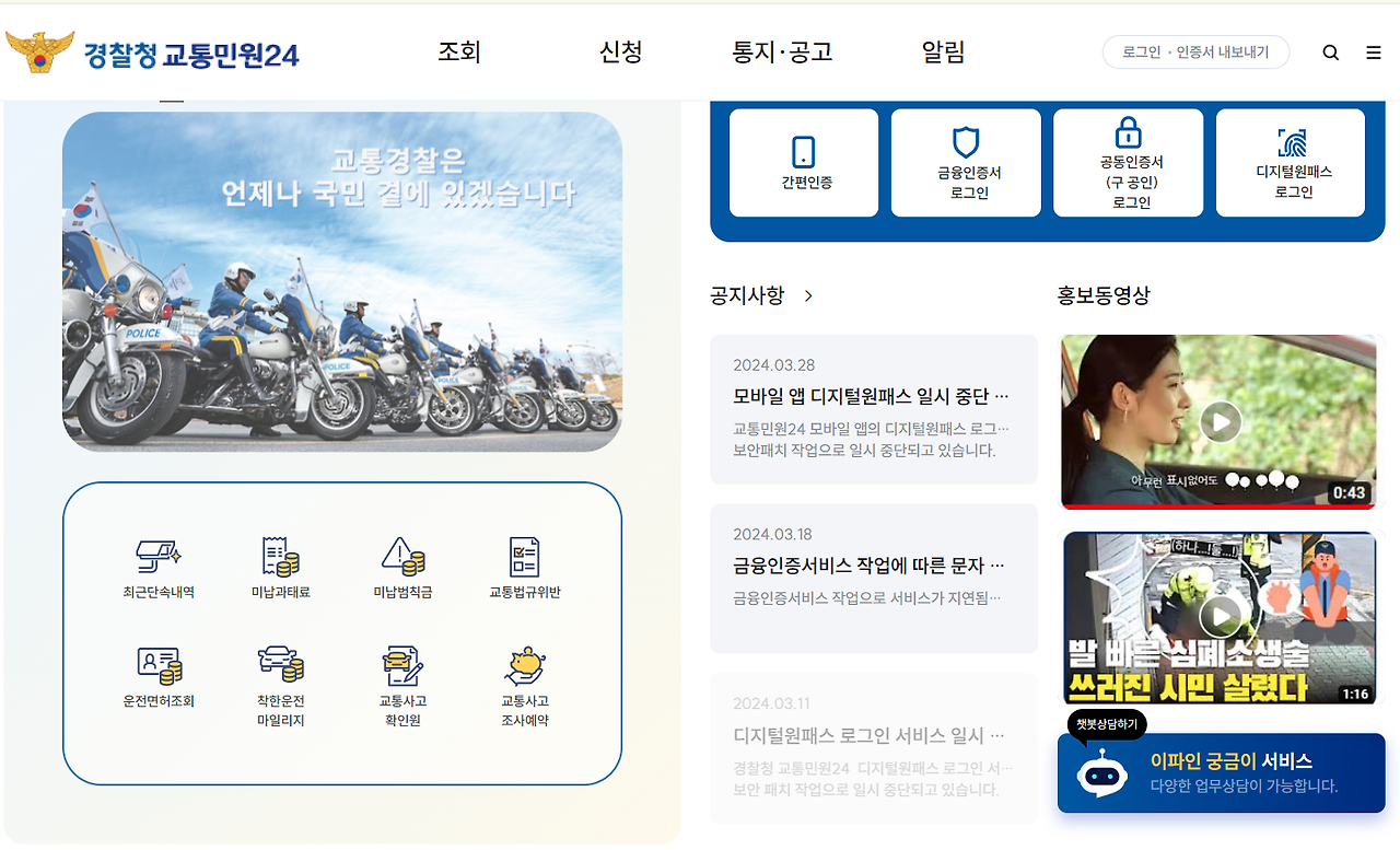 경찰청 교통범칙금 과태료 조회 이파인 홈페이지, 교통민원 24