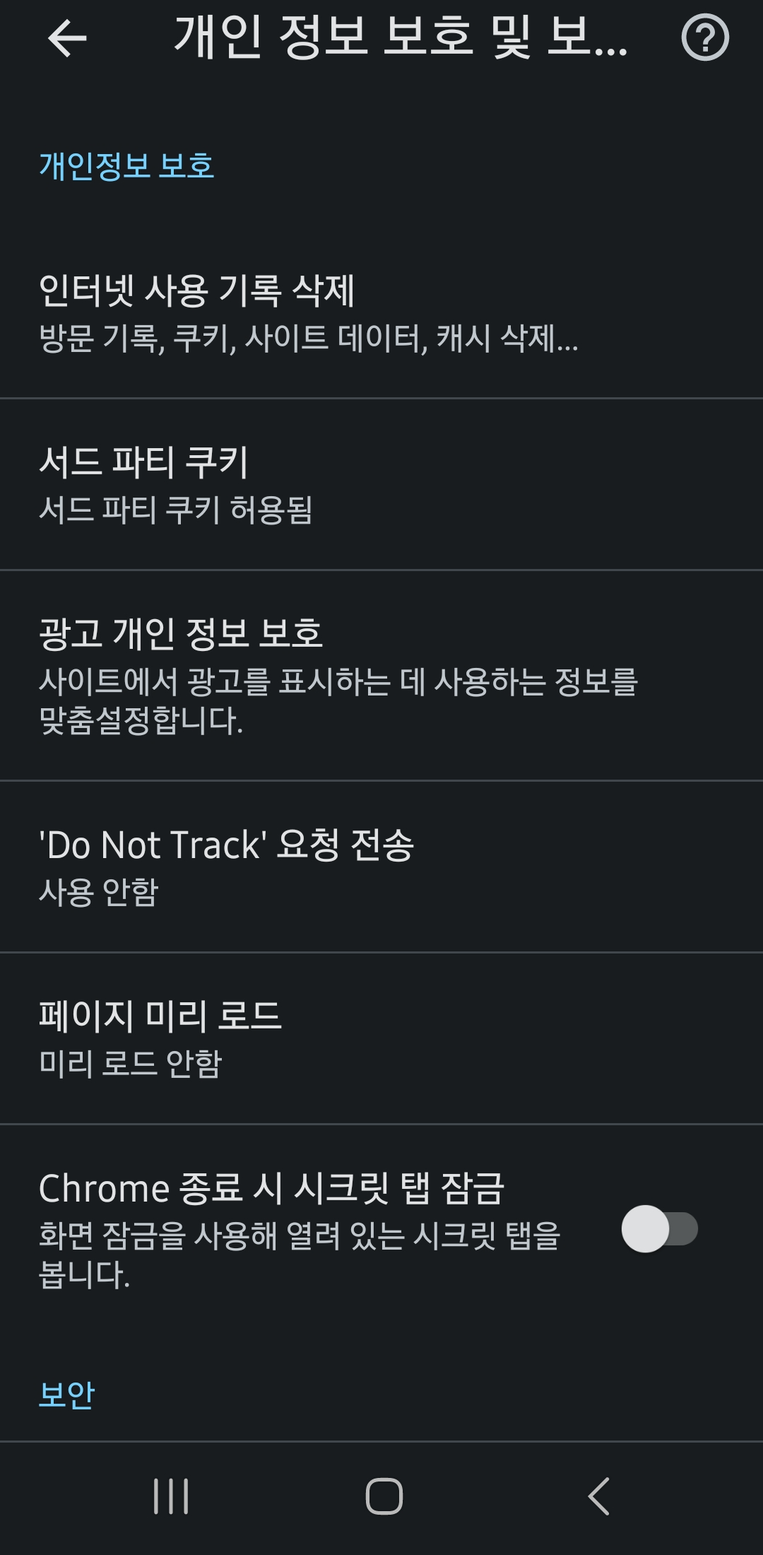 - '개인정보 및 보안' 섹션으로 이동합니다.