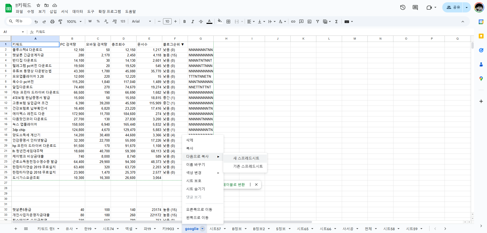 구글 스프레드시트 시트 복사 방법