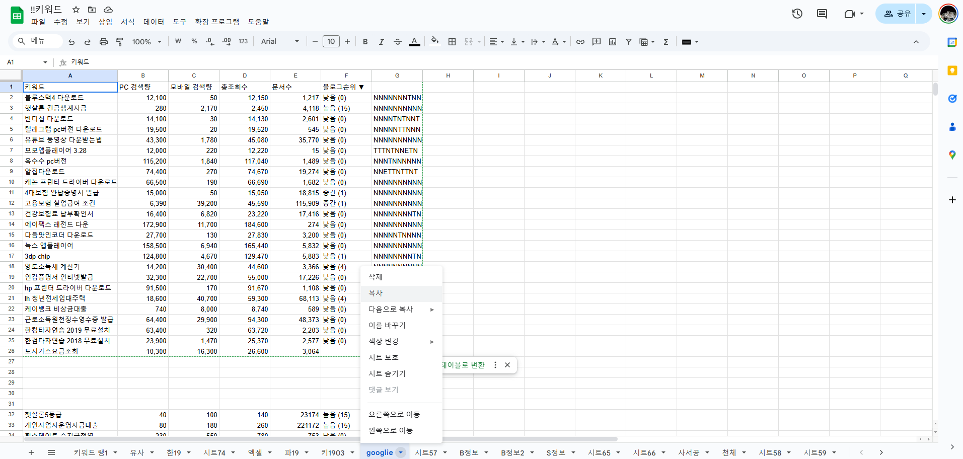 - 시트 탭 우클릭: 구글 스프레드시트 하단에 있는 시트 이름 탭을 우클릭합니다.