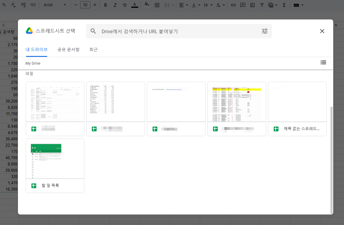 - 대상 스프레드시트 선택: 이동하고자 하는 스프레드시트를 선택합니다. 이때 대상 스프레드시트는 본인의 계정에서 접근 가능한 상태여야 합니다.