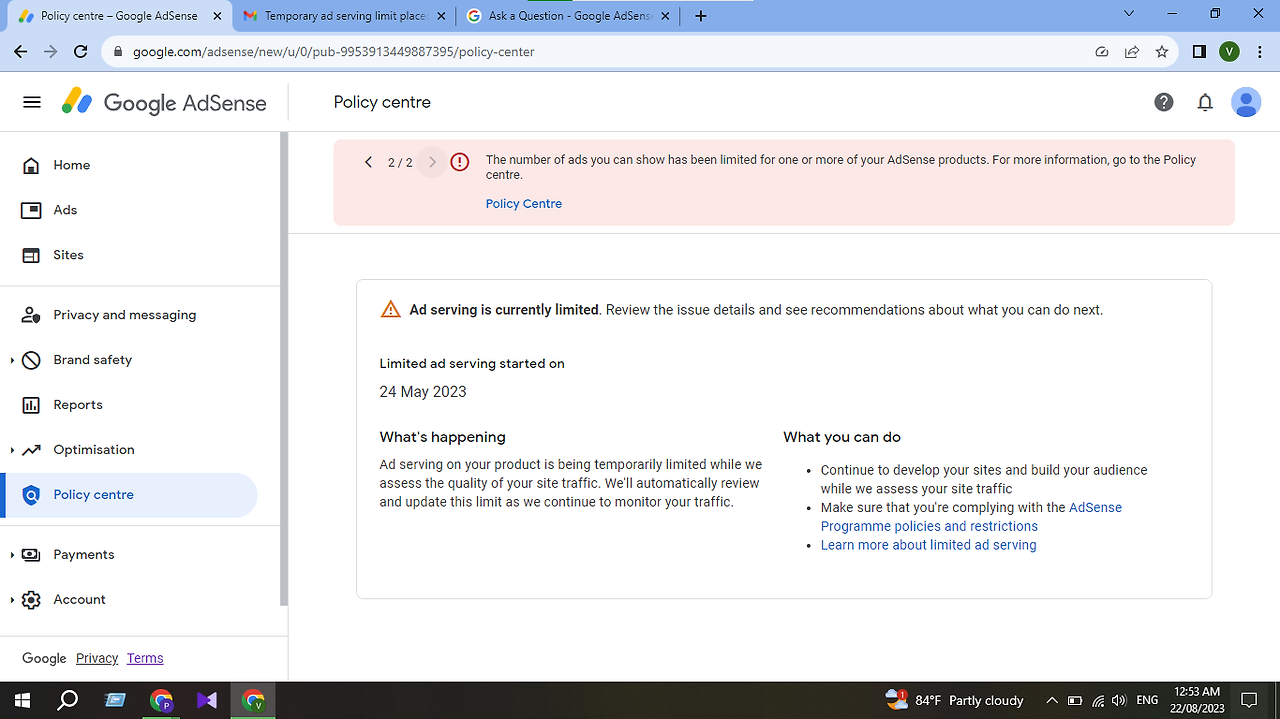 - 트래픽 품질 문제: 트래픽이 부정확하거나 비정상적인 경우, 예를 들어 봇 트래픽이나 저품질 트래픽이 많을 경우에도 광고가 제한될 수 있습니다.