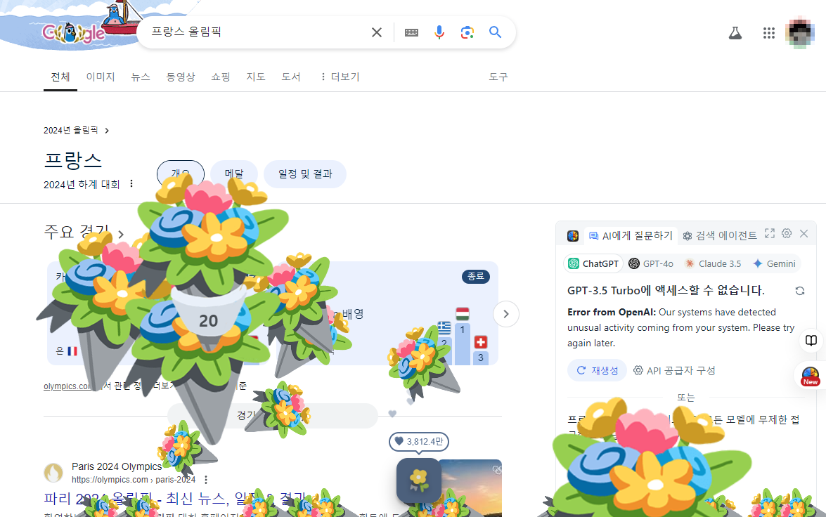 구글에서 '프랑스올림픽'을 검색하면 최근 메달 수여자 정보와 함께 꽃다발 투척 버튼이 나타납니다. 이 기능은 올림픽 팬들에게 흥미로운 정보를 제공하며, 화면에서 꽃다발을 던지는 재미를 선사합니다.