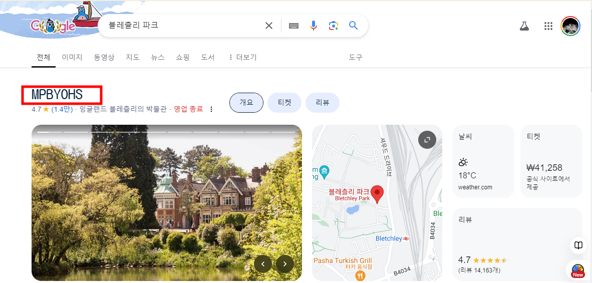 '블레츨리 파크'를 검색하면 암호가 해독되는 것처럼 문자가 뒤섞였다가 제자리로 돌아오는 효과가 나타납니다. 이 기능은 암호 해독과 관련된 흥미로운 경험을 제공합니다.