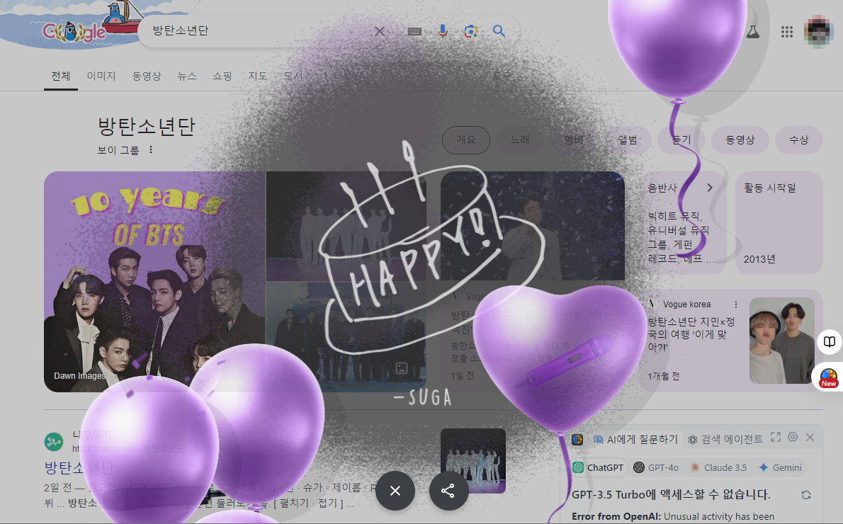 구글 검색창에 'BTS'나 '비티에스', '방탄소년단'을 입력해 보세요. 검색 결과 페이지의 왼쪽에는 작지만 매력적인 풍선 아이콘이 나타납니다. 이 풍선을 클릭하면 화면에서 풍선이 올라오고, 각 풍선에는 다양한 효과가 동반됩니다. 풍선이 터지면 화면이 보라색으로 변하며, X 버튼을 눌러서 모든 효과를 리셋할 수 있습니다. BTS 팬이라면 이 작은 장난에 즐거움을 느낄 수 있을 것입니다.