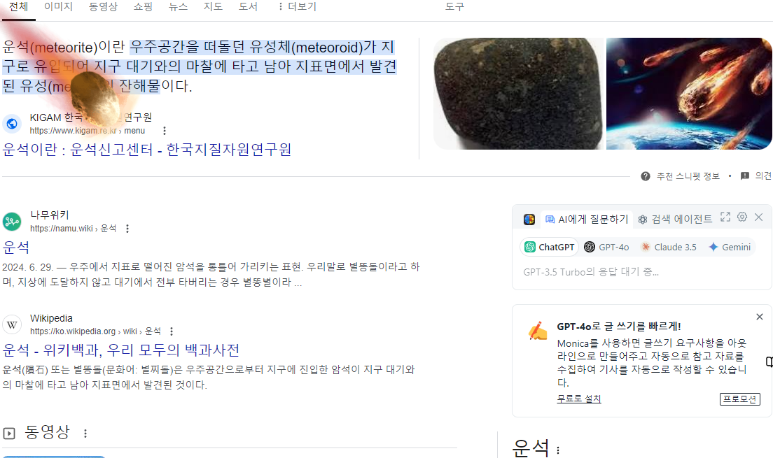 '운석'이라는 키워드를 검색하면 화면에 운석이 떨어지는 모습을 볼 수 있습니다. 운석이 떨어진 뒤에는 깨알 같이 화면이 흔들립니다. 이 작은 시각적 효과는 흥미로운 경험을 제공하며, 우주에 대한 관심이 있는 사용자들에게 특히 매력적일 것입니다.