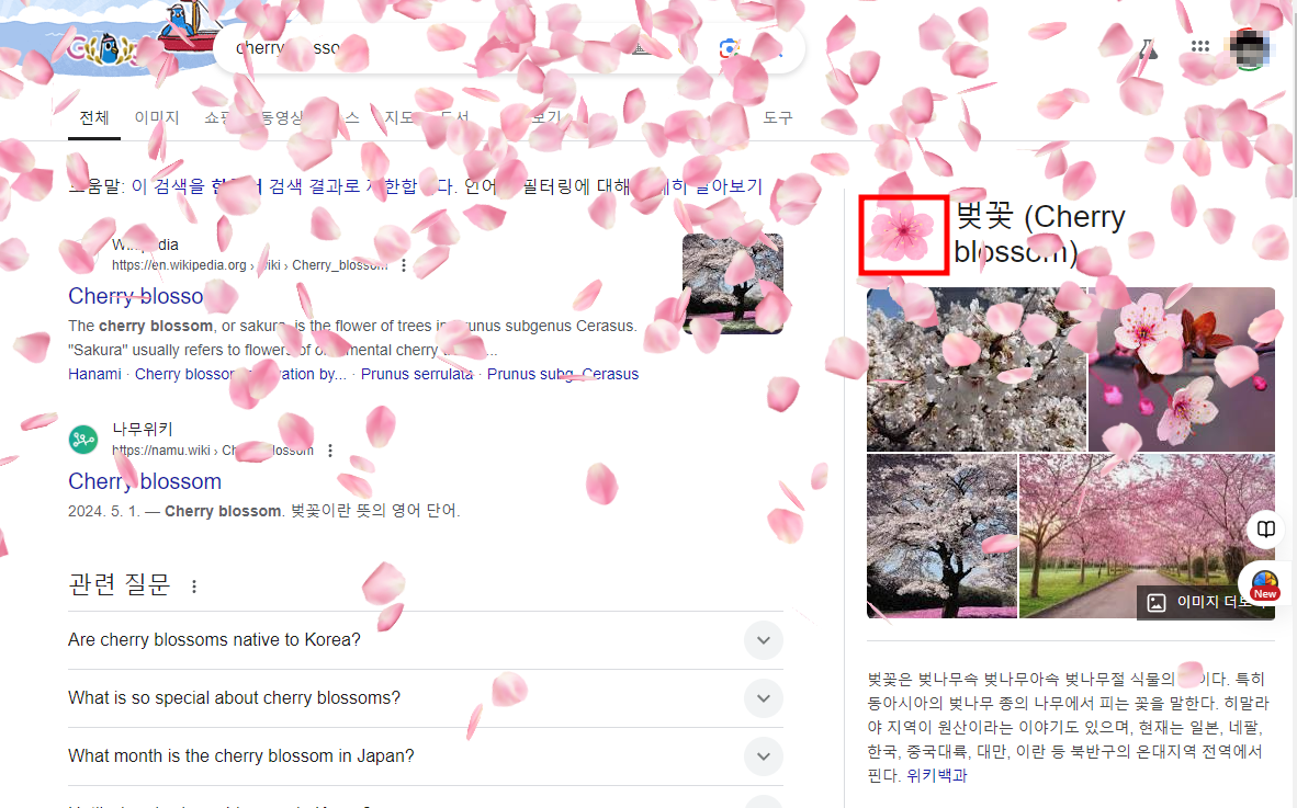 구글 검색창에 '벚꽃축제'를 입력하면, 벚꽃 아이콘이 나타납니다. 이를 클릭하면 화면에 벚꽃이 내리며, 봄의 아름다움을 잠시나마 느낄 수 있습니다. 이 기능에는 리셋 버튼이 없으므로, 벚꽃이 내리는 아름다운 장면을 즐길 수 있습니다.