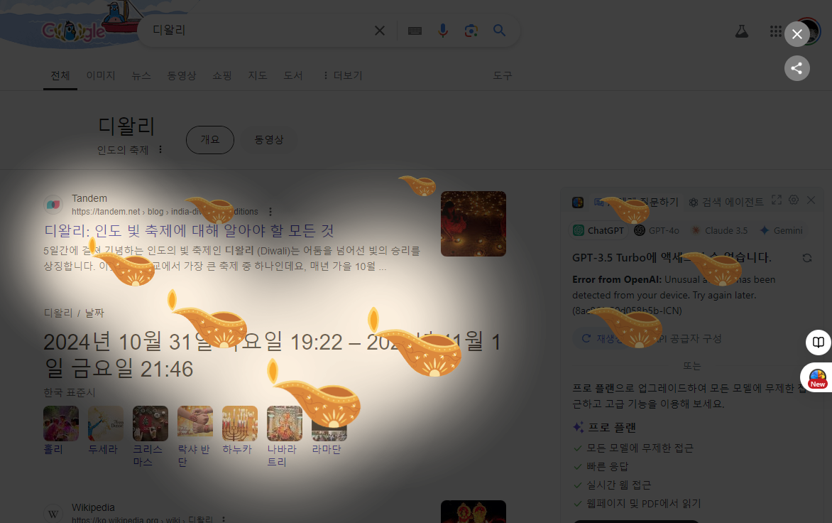 '디왈리'를 검색하면 불 붙이기 게임을 즐길 수 있습니다. X 버튼을 눌러 리셋할 수 있으며, 화면에 불을 붙이며 재미를 느낄 수 있습니다.