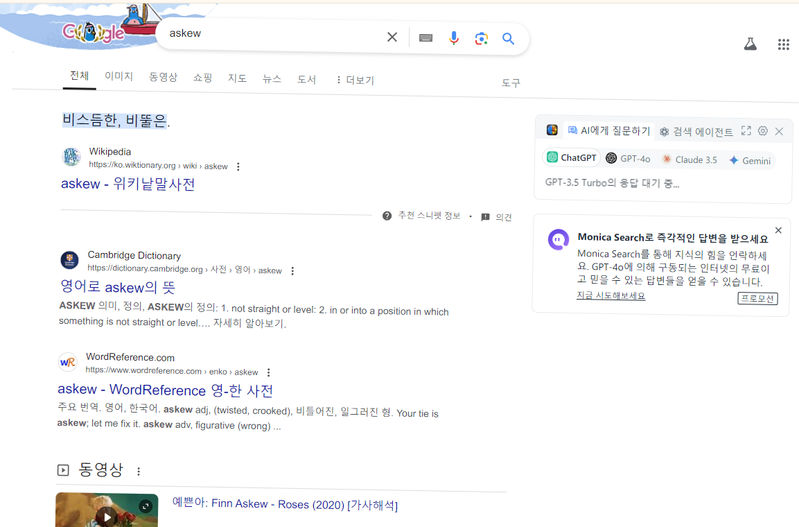구글에서 ‘askew’를 검색하면, 화면이 비스듬히 기울어지는 독특한 효과를 볼 수 있습니다.