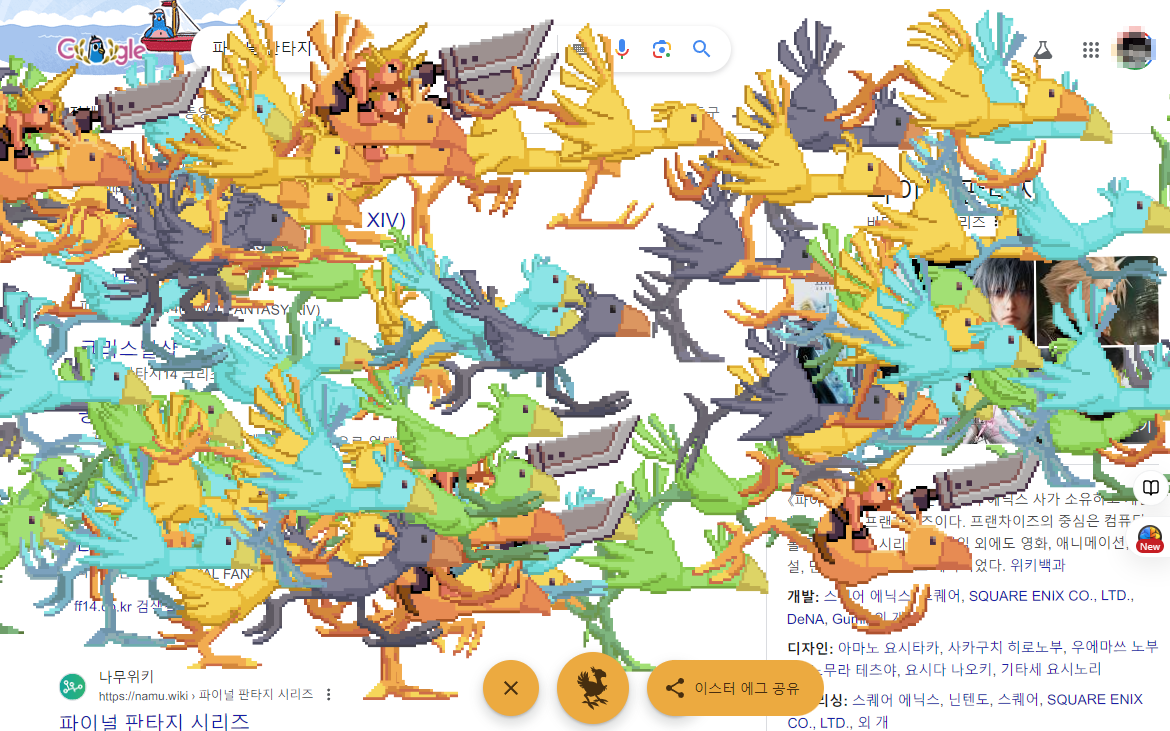 구글에서 '파이널판타지'를 검색하고 새 아이콘을 클릭하면 글자들이 울리며, 새 무리가 지나가는 효과가 나타납니다. 이 효과는 게임 팬들에게 반가운 재미를 제공합니다.