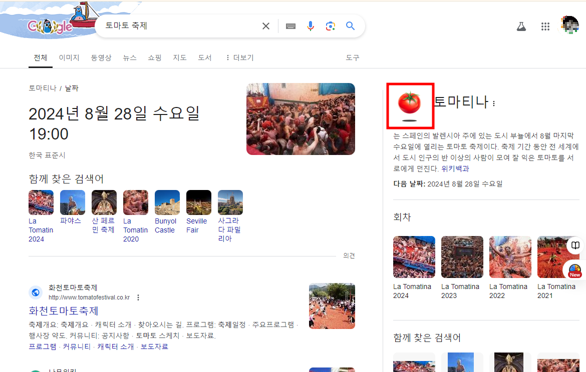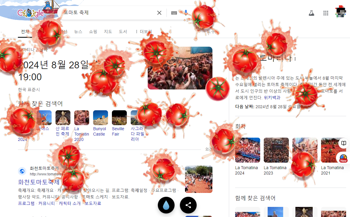 구글에서 '토마토축제' 또는 '토마티나'를 검색한 후, 나타나는 토마토 아이콘을 클릭해 보세요. 화면에 토마토를 던질 수 있는 재미있는 기능이 활성화됩니다. 물 모양의 버튼을 눌러 리셋할 수 있으며, 토마토를 화면에 던지는 재미가 기분 전환에 도움이 될 것입니다.