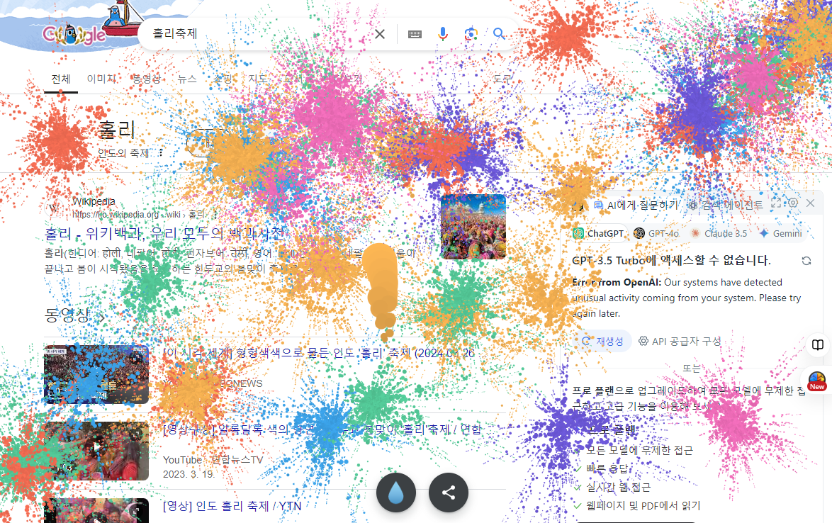 '홀리' 또는 '홀리축제'를 검색한 후 나타나는 물감 아이콘을 클릭하면, 화면에 물감을 던져서 색깔을 입힐 수 있습니다. 이스터 에그는 물 모양 버튼을 눌러 리셋할 수 있으며, 화면이 다채로운 색상으로 변하는 재미를 제공합니다.