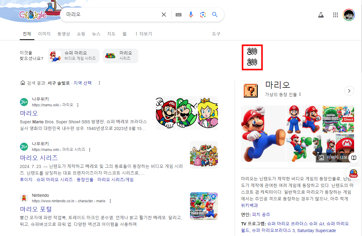 '마리오'를 검색하면 럭키박스 아이콘이 나타납니다. 클릭하면 동전이 생성되며, 마리오 팬들에게 반가운 재미를 제공합니다.