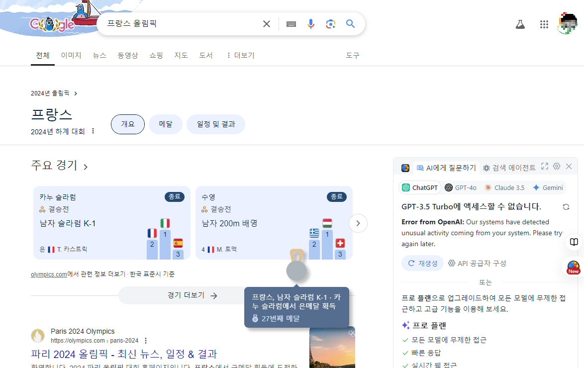 구글에서 '프랑스올림픽'을 검색하면 최근 메달 수여자 정보와 함께 꽃다발 투척 버튼이 나타납니다. 이 기능은 올림픽 팬들에게 흥미로운 정보를 제공하며, 화면에서 꽃다발을 던지는 재미를 선사합니다.
