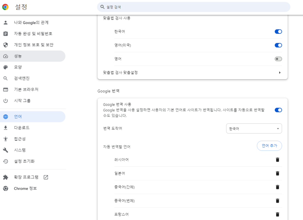 - 자동 번역 설정: 자주 사용하는 언어에 대해서는 '이 언어로 된 사이트 자동 번역' 옵션을 활성화합니다.