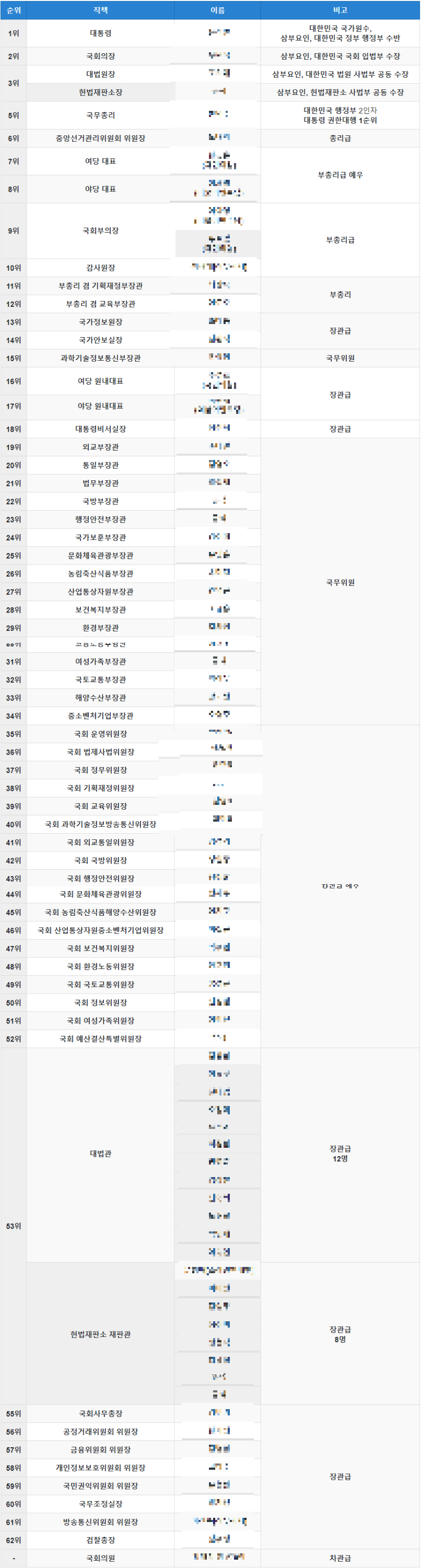 - 32위 이하로는 국회 상임위원장, 대법관, 헌법재판관, 특임 장관 등이 순차 배치됩니다.
