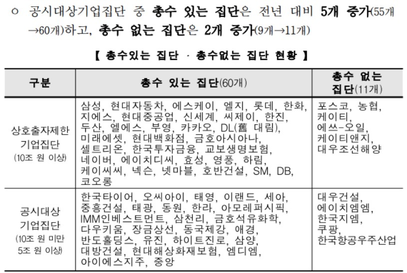 정부에서는 공시대상 기업집단을 구분해 두고 있습니다. 이 순위는 매년 4월 말에서 5월 초 공정위에서 대기업집단 순위로 발표합니다. 2021년 현재 총 71개의 기업집단이 발표됐습니다.