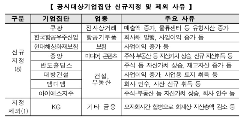 쿠팡, 한국항공우주산업, 현대해상 화재보험, 중앙, 반도 홀딩스, 대방건설, 엠디엠, IST지주가 2021년에 새로 대기업집단으로 진입했습니다.