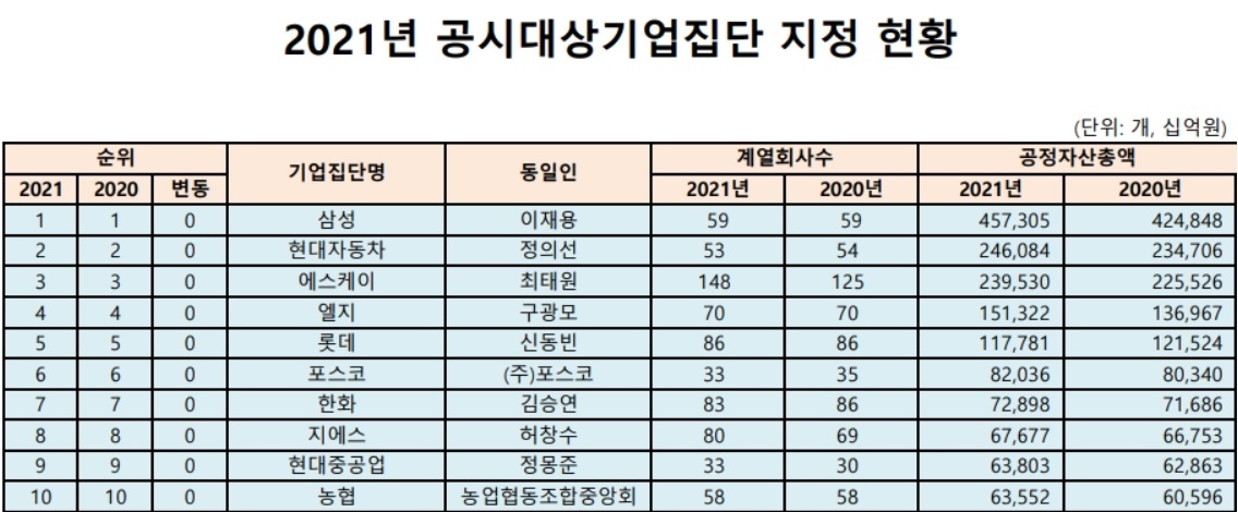 정부가 공식 지정한 2021년 대기업 순위는 다음과 같습니다.