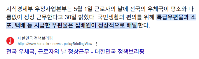 하지만 쿠팡이라는 365일 배송하는 업체가 생긴 뒤로는 우체국도 근로자의 날 휴무하기 힘들어졌습니다. 따라서 근로자의 날 우체국택배도 정상 배달됩니다.
