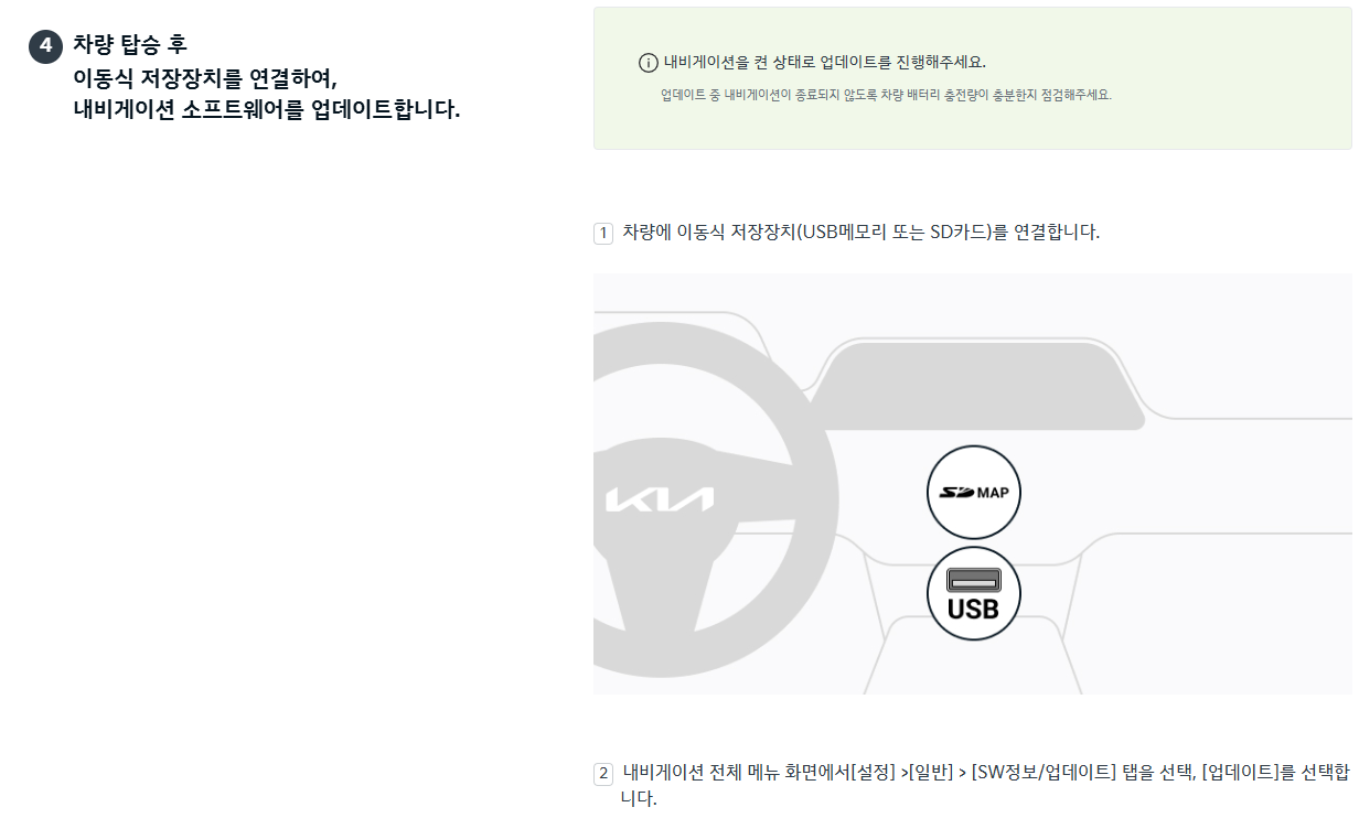 - 일부 공지에서는 엔진을 켠 상태로 업데이트할 것을 권장합니다. 다만 공회전 관련 법규를 준수해야 합니다.