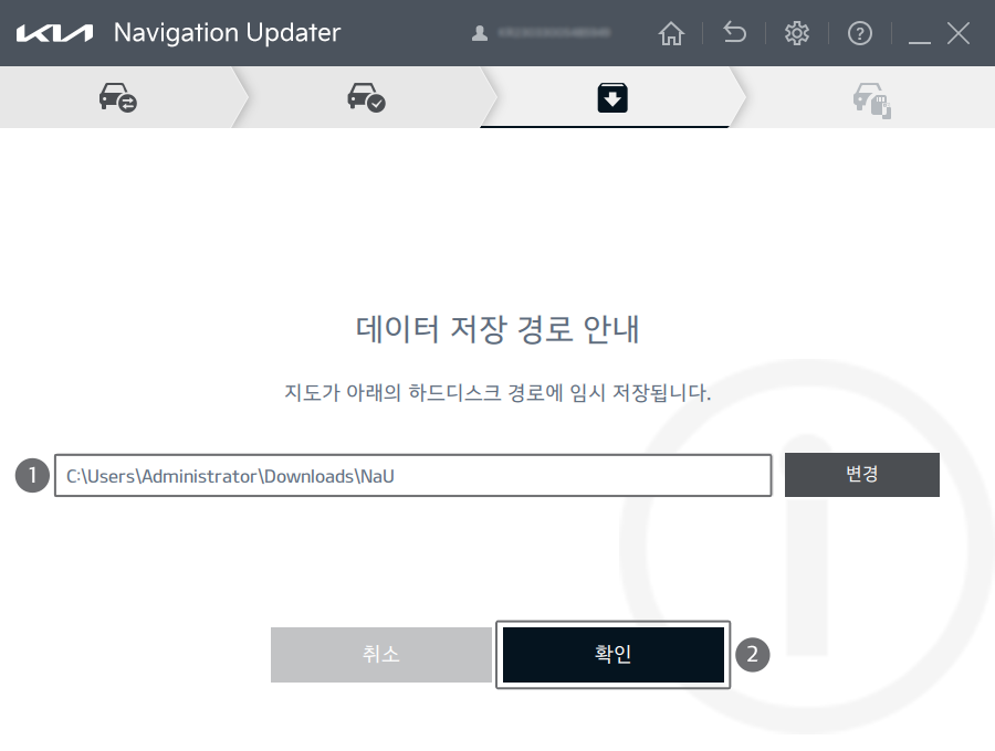- 선택한 차량이 맞는지 확인하고 업데이트 데이터를 저장할 위치를 선택합니다.