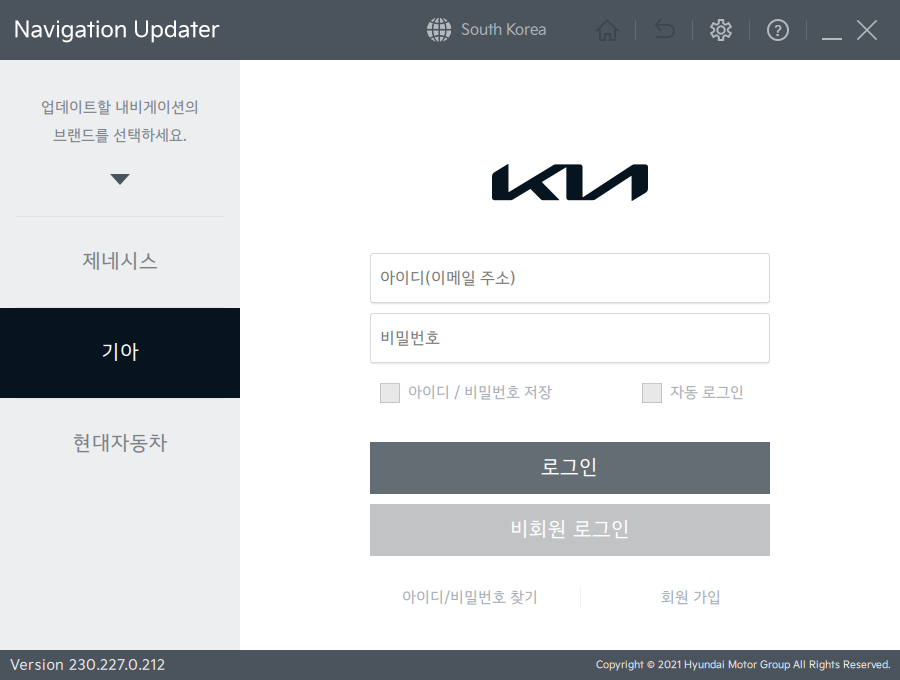 기아자동차의 내비게이션 업데이트는 'Navigation Updater' 프로그램을 통해 간단하게 할 수 있습니다. 프로그램을 실행한 뒤, 기아 홈페이지에 가입된 계정 정보를 이용해 로그인하면 됩니다. 여기에는 아이디와 비밀번호를 저장할 수 있는 옵션, 그리고 자동 로그인 기능도 포함되어 있어 편리합니다. 이 외에도 아이디나 비밀번호를 잊어버렸을 때 찾을 수 있는 기능, 새로운 계정을 만들 수 있는 회원가입 기능 등도 있습니다.
