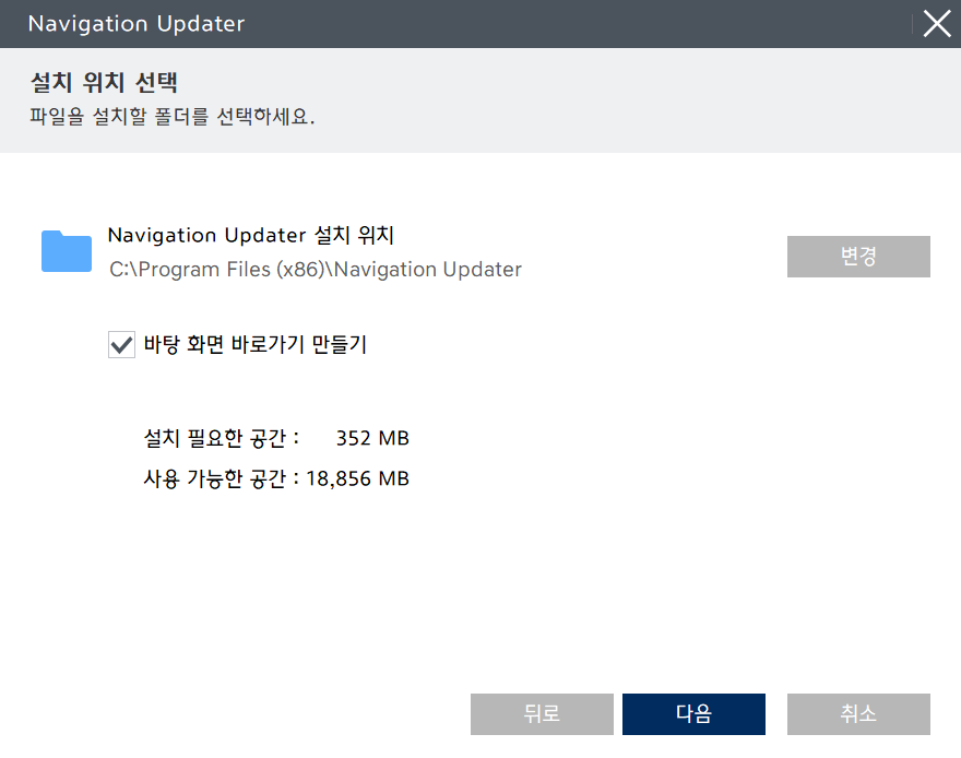 - 프로그램 설치 경로 이용: 설치된 경로에 있는 'Navigation Updater' 실행 파일을 더블 클릭하여 실행할 수도 있습니다.